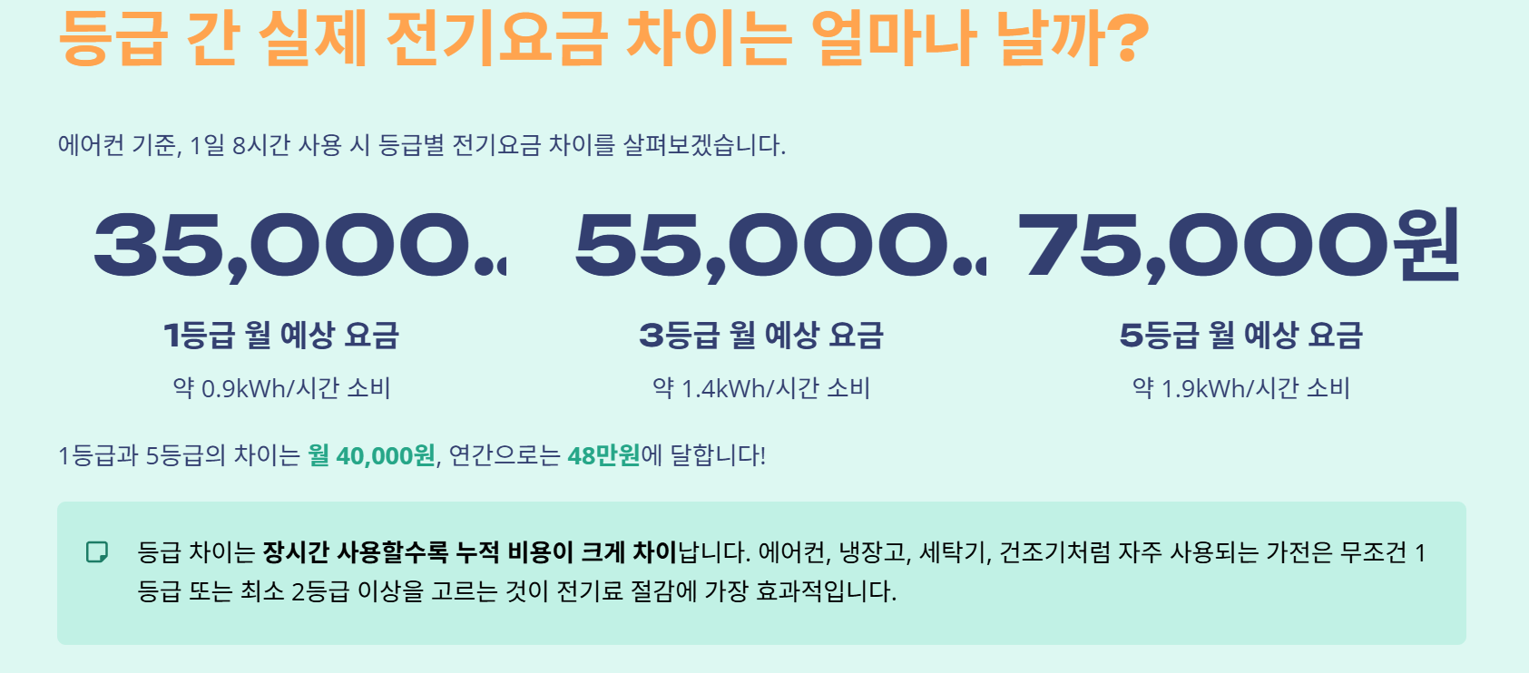 📌 소비전력(kWh) + 월 전기요금 예측치 + 최신 등급 기준 반영 여부까지 체크하면